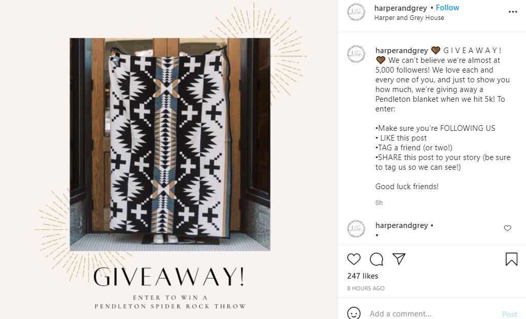 For example, you can run an Instagram giveaway that requires followers to share your post and tag other friends to join, such as this one from Harper and Grey House.