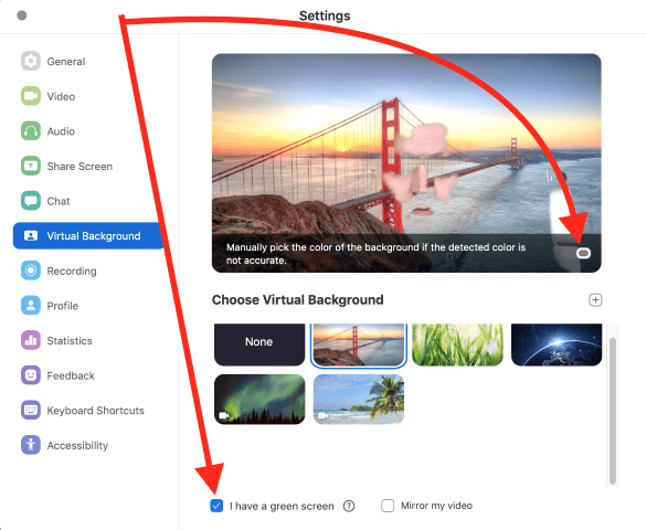 4. If you have a green screen, check the box that says ‘I have a green screen’. Choose the background of your choice.