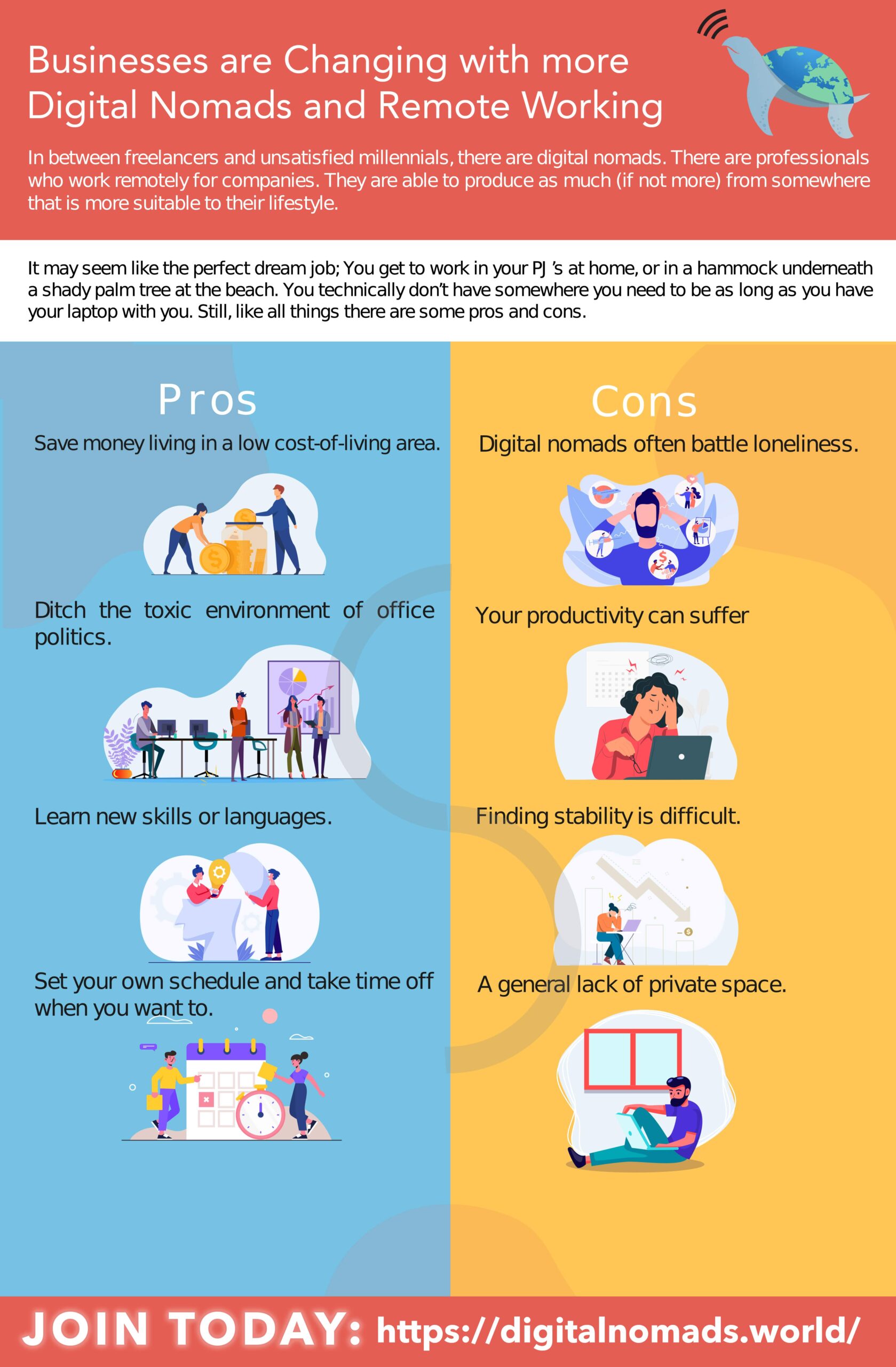Many people aspire to be a digital nomad and if you’re one of those people you should know that it’s take a lot of motivation and hard work to be a successful digital nomad. The infographic visually displays the advantages and disadvantages of being a nomad and some of the negatives can really impact people, so be vary.