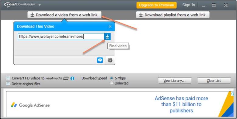 - Now, under Download a video from a web link, copy and paste the JW Player video URL and click on the Download icon.