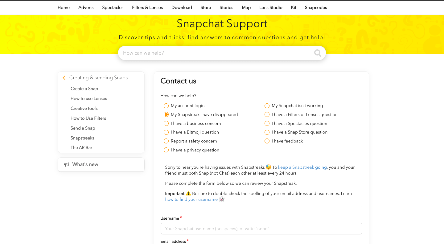 - A new page with contact us as a title will come up. Then select the “My Snapstreaks have disappeared” option.