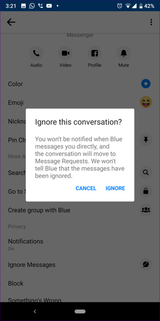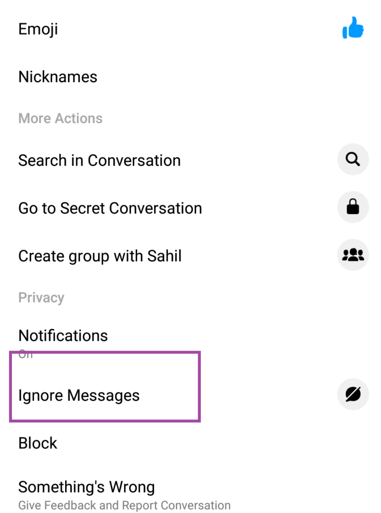 Ignore is a recently added feature in Messenger. Once you Ignore a contact, you won’t receive any message notification from the contact. But unlike Mute, once you Ignore someone, the conversation will move to the Message Request section.