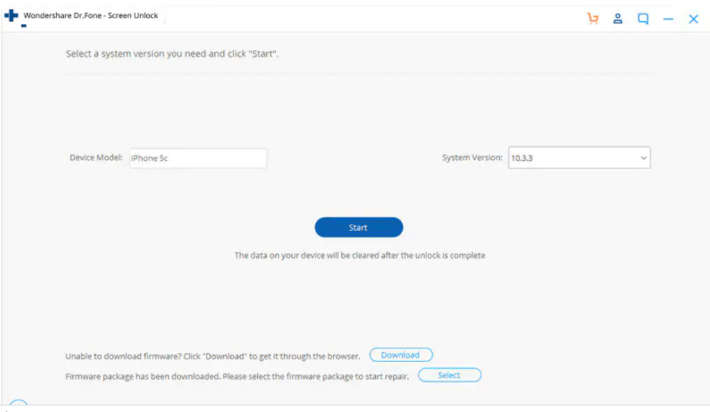 - Next, a window will appear where you need to fill in the device model, system version and then click on start. (if your phone is not connected go by the DFU mode).
