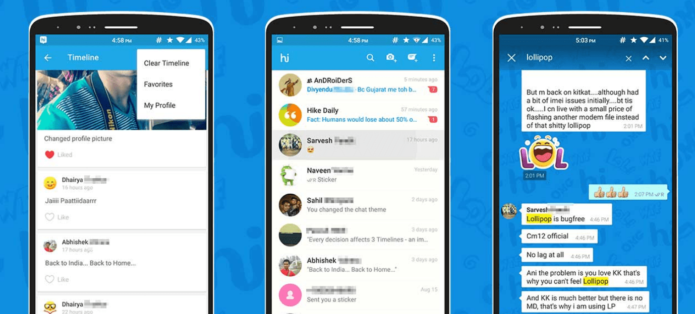 Developed in India, Hike messenger app is quite light and very easy to use. It features a modern UI that looks like iMessage and has the features to match.