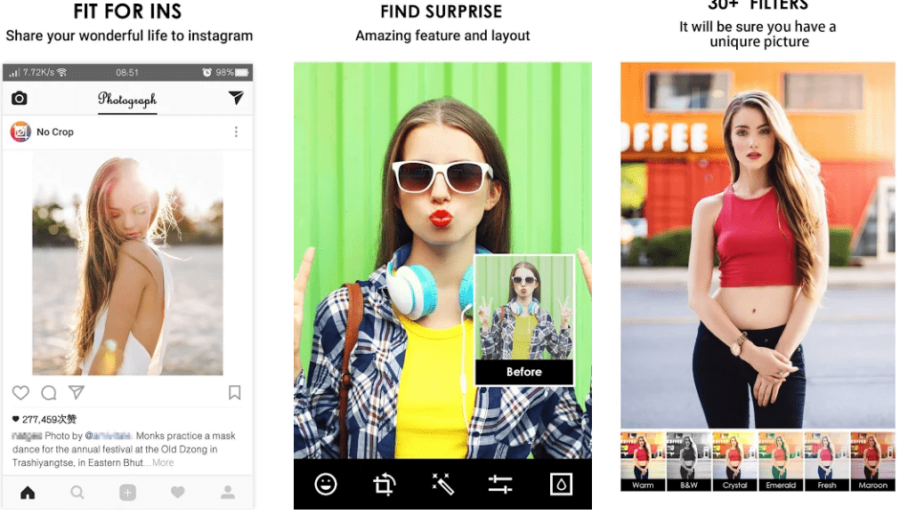 - With NoCrop, you can edit your photos with multiple filters, effects and smiley emojis to make your photos more popular and special.