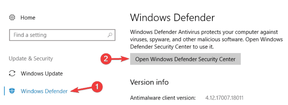 - You will see either Windows Security or Windows Defender on the left side. Click on it.